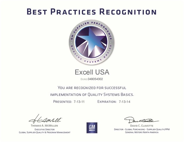 Excell USA Inc. has received the 2013 "GM Supplier Quality Excellence Award" from General Motors, for 2 consecutive years in a row.