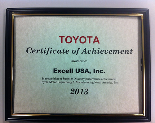 Excell USA receives 2013 Supplier Diversity Award from Toyota