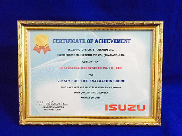 THAI EXCELL MANUFACTURING was awarded by ISUZU MOTOR CO., (Thailand) LTD. 2 consecutive years in a row.
